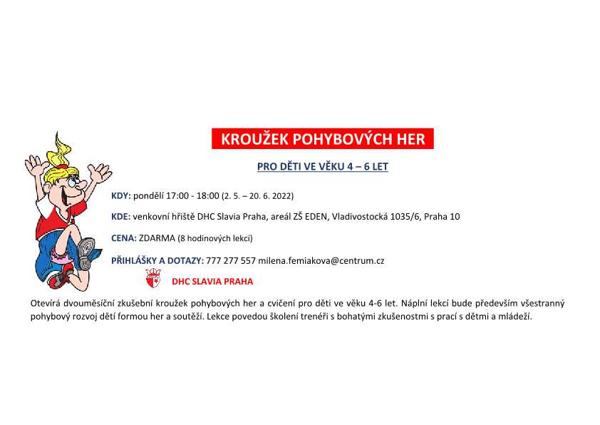 Otevírá dvouměsíční zkušební kroužek pohybových her a cvičení pro děti ve věku 4-6 let. Náplní lekcí bude především všestranný pohybový rozvoj dětí formou her a soutěží. Lekce povedou školení trenéři s bohatými zkušenostmi s prací s dětmi a mládeží.